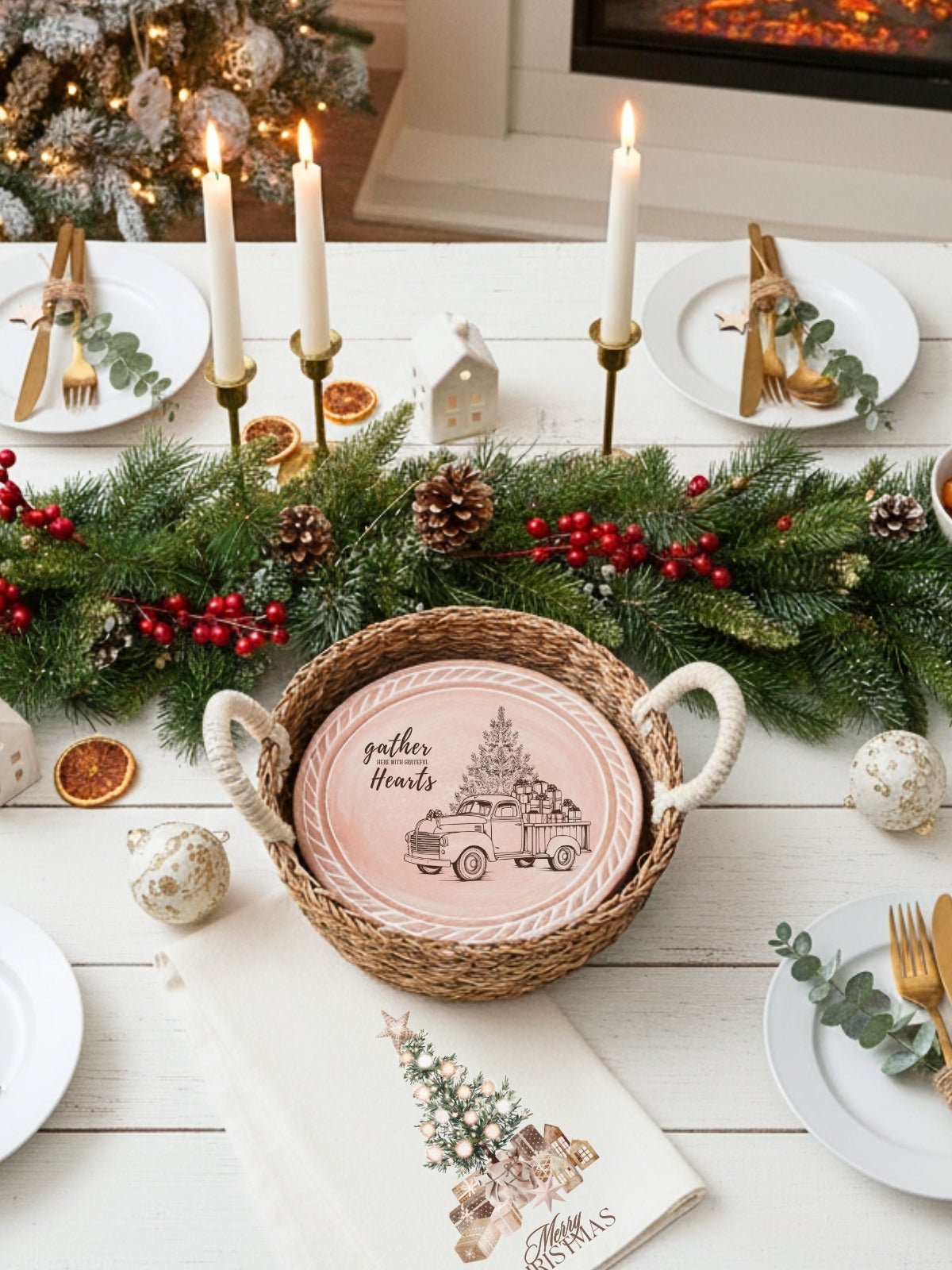 Bring the warmth of the season to your table with our charming Christmas Truck Bread Warmer & Woven Basket set and Tea Towel Set. This isn’t just a kitchen accessory; it’s a celebration of holiday gatherings, designed to keep your bread warm and your celebrations full of good cheer. The set features a terracotta warmer with a cheerful Christmas truck design, ready to be heated and placed inside the basket. The warmer fits snugly within a handwoven, sustainably sourced basket, creating a rustic and inviting display that perfectly complements your holiday decor.